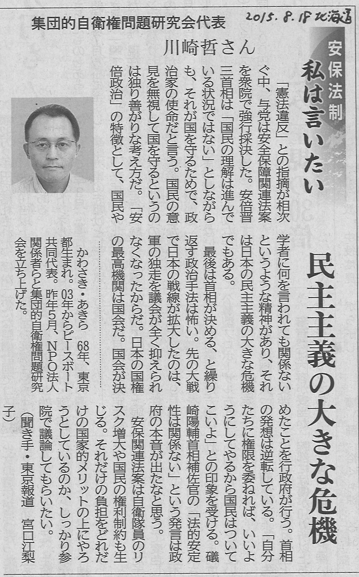 北海道新聞「安保法制 私は言いたい」シリーズのインタビュー記事。