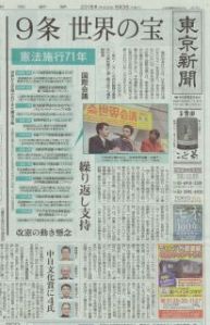 翌3日の東京新聞には「平和賞メダル貸します」という見出しでこのことが報じられたほか、なんと10年前の「9条世界会議」のことが特集で取り上げられています。私はこの世界会議の実行委員会事務局長をつとめましたが(それは本当に大変な仕事でしたが)、なぜあの会議を開いたのか、どのような意義があったのかということについて長いインタビューで話をさせてもらいました。9条は「世界の宝」という見出しの記事で、日本の憲法9条が国際的に評価された主要な10の国際会議が並んでいますが、私はこのうち7つに参加しており、これらのいくつかの提言や宣言の策定過程にかかわってきましたので、このような形でまとまった記事が出たことは感慨深いです。