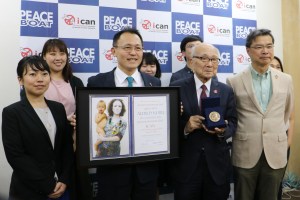 憲法記念日の前日にあたる5月2日、ピースボートで記者会見を行い、昨年ICANがいただいたノーベル平和賞のメダルと賞状を、これから地球一周&全国出張させていきますという発表をしました。昨年のノーベル平和賞は、核兵器禁止条約の成立に対して貢献した世界的なNGO・市民運動の連合体であるICANに贈られました。広島・長崎の被爆者や世界各地の核実験被害者が、この運動の先頭に立ってこられました。この平和賞は、こうした核の被害者をはじめ、核兵器の禁止と廃絶のために努力してきたすべての人たちに向けられたものです。