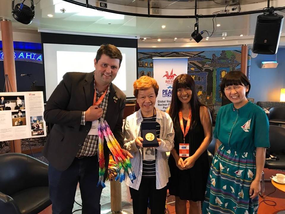 渡辺さんは、第100回ピースボート(昨年12月日本発、地球一周96日間)に先月ブラジルから乗船し、寄港する南米や太平洋諸国で被爆者としての訴えや核兵器禁止条約の批准要請を、おりづるユース特使の森山景さんと共に行っています。