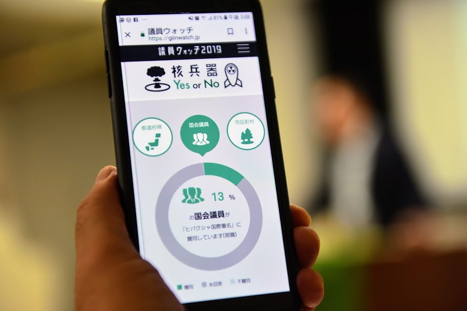 議員ウォッチは、すべての現職の国会議員に、ヒロシマ・ナガサキの被爆者が訴える核兵器廃絶国際署名(通称「ヒバクシャ国際署名」)への賛同の有無を尋ねています。本日現在、ヒバクシャ国際署名に賛同を表明しているのは全国会議員の13パーセントにとどまっています。不賛同を表明したのは1名のみ。その他の約86パーセントは「未回答」です。議員ウォッチのプロジェクトチームは今年1月の発足以来、さまざまな方法でくり返し議員たちに回答を求めてきましたが、回答がこれだけ少ないのは、議員の関心が低いこと、さらには、回答しなくても国民の関心も高くないし問題ないだろうと議員が高をくくっていられる現状を示していると思います。(2019.6.25 毎日新聞ー 「議員ウォッチ」から見える国会議員の実態 運営者「非常に貧弱」)
