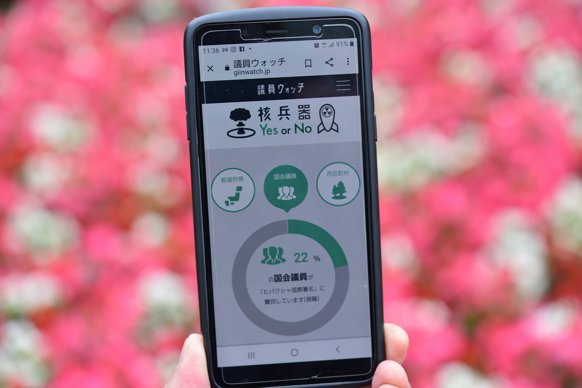 「議員ウォッチ」は、日本の国会議員が核兵器禁止条約に賛同しているかどうかをウォッチするスマホ用のサイトです。いま「Go To ヒジュン!キャンペーン」として、大学生をはじめ多くの皆さんと一緒に「議員ウォッチ」を使って国会議員一人ひとりに働きかけを行っています。日本が核兵器禁止条約に批准するようにするためには、今から1~2年、まずは議員に意識をもってもらい、選挙の争点にもしていくことが重要だと思います。