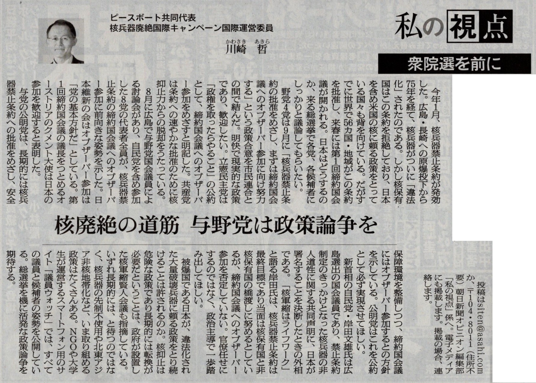 核兵器禁止条約は、非核保有国主導の取り組みである。核保有国はこれに反発しており、首相も指摘しているように、一カ国も入っていない。首相はだから核保有国と非核保有国の「橋渡し」をしていくという。しかし「橋渡し」するのが本気なら、核保有国とも軍縮の努力をし、非核保有国とも協力を深めつつ、両者の対話を促進するということになろう。非核保有国が主導する核兵器禁止条約の締約国会議の場に出ていき、そこで日本の立場を述べることこそまさに「橋渡し」にふさわしい行動ではないか。