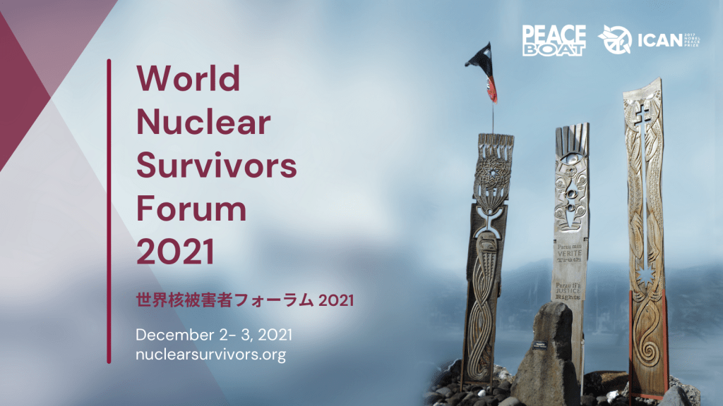 ピースボートは、ICAN(核兵器廃絶国際キャンペーン)と協力して、2021年12月2~3日(日本時間では12月3日)に「世界核被害者フォーラム2021」をオンラインで開催します。これは、世界の核兵器の被害者の声を集め、被害地域の状況を学び合い、その取り組みや行動について共有するためのオンラインの国際フォーラムです。太平洋、北米、ヨーロッパ、そして日本を含むアジアから、ウラン採掘、核実験、核兵器の生産そして使用の被害者らが集まります。