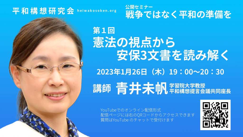 第1回は1月26日に、平和構想提言会議の共同座長をつとめた学習院大学の青井未帆教授を招いて「憲法の視点から安保3文書を読み解く」として開催しました。そのアーカイブは以下のリンクでご覧になれます。今後とも是非平和構想研究会の活動にご注目ください。