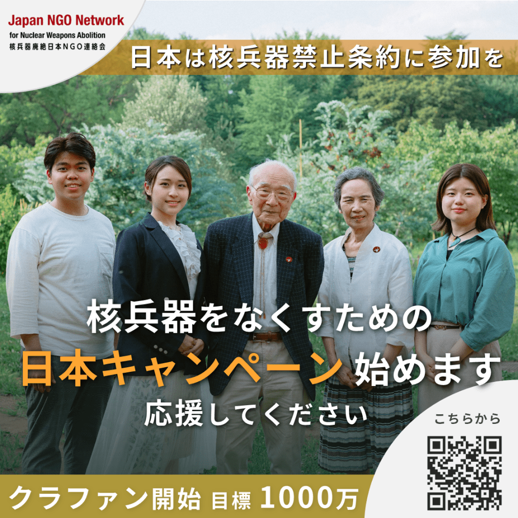 核兵器廃絶に取り組む日本の多くの団体・個人が集う核兵器廃絶日本NGO連絡会では、昨年来、こうした日本キャンペーンの立ち上げの可能性について議論を重ねてきました。そしてこのたび、同連絡会が母体となった新しい日本キャンペーンを立ちあげることを決め、その立ち上げのためのクラウドファンディングを開始したのです。国際平和デーである9月21日(木)までに1000万円を集めることを目標にしています。7月24日に始め、出だしは順調ですが、1000万円というのはそう簡単に集められる金額ではありません。皆さんお一人お一人のご支援が必要です。どうぞよろしくお願いします。