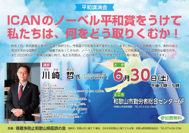 6月30日(土)和歌山 15:00~ 和歌山市勤労者総合センター6階 核戦争防止和歌山県医師の会主催講演会